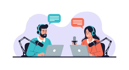 Male and female podcast hosts sitting at desks with professional microphones and laptops engaging in a creative conversation.