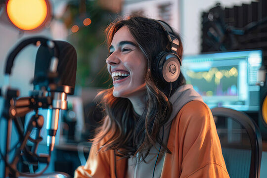 Cheerful young woman recording podcast in studio, radiating enthusiasm and professionalism