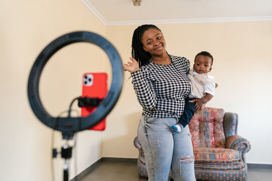 Smiling mother with son waving to camera of smartphone
