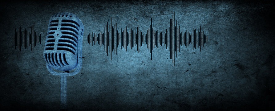 Microphone generating blue sound waves, representing recording, podcasting, voice messaging, radio, and digital sound on a transparent background
