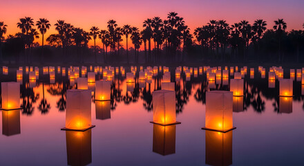 Mesmerizing display of floating lanterns ascending gracefully over tranquil waters casting enchanting glows that symbolize wishes and spiritual renewal in  Photo Stock  Concept  and empty space on the
