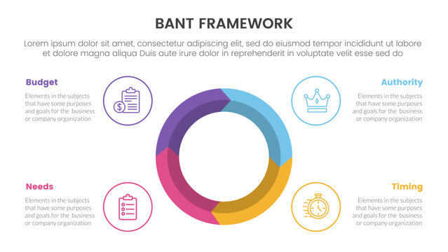 bant sales framework methodology infographic with big circle on center 4 point list for slide presentation vector