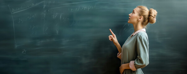 A teacher pointing at the chalkboard during a lesson, highlighting a concept; symbolizing the role of educators in imparting knowledge and the classic classroom setting.