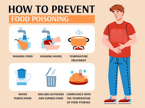 How to prevent food poisoning informative banner with cartoon character of sick man, flat vector illustration. Medical explanation of food poisoning prevention.