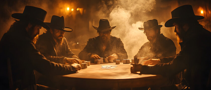 Ghostly cowboys gathered around a dimly lit poker table in a haunted saloon playing cards on an eerie Halloween night in the old Wild West Supernatural atmosphere with smoke shadows and a spooky