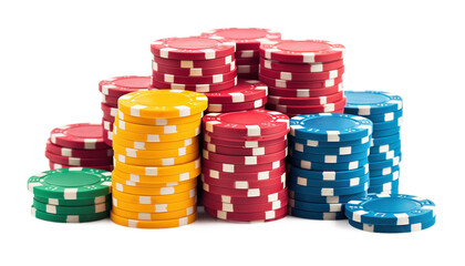 Stacks of poker chips on a casino table with colorful slot machines and bright lights in the background.