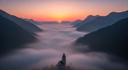 Mountain valley with church spire poking through clouds at sunrise