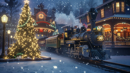 Christmas polar express arriving at station during Christmas snowy night with decorated Christmas tree