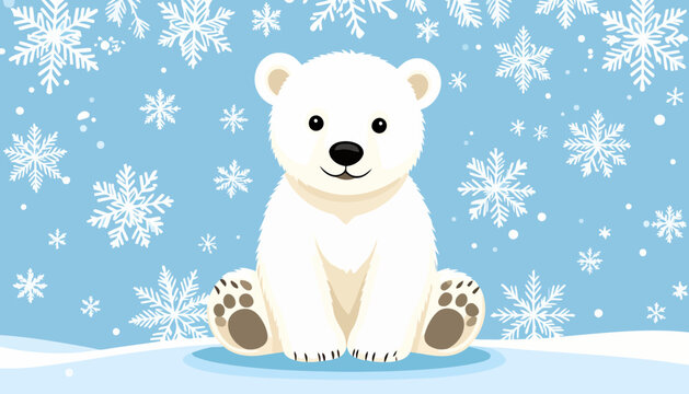 Adorable cartoon polar bear cub with fluffy white fur, sitting happily with a gentle smile and visible paw pads.