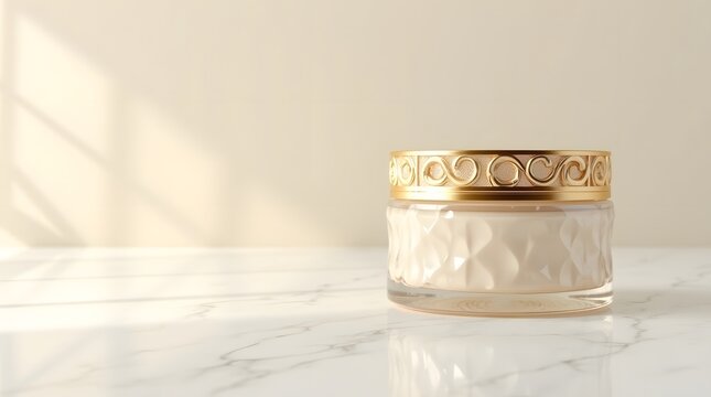 Elegant cream jar with a golden lid, resting on a marble surface bathed in soft, natural light.