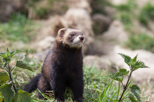 Eurasian polecat (Mustela putorius) standing in the sun among some nettles.