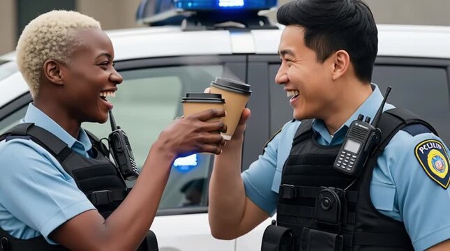 Two Police Officers Laughing Together with Coffee Cups Outside Patrol Car