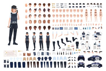 Policewoman animation set or DIY kit. Bundle of female police officer body parts, faces, hairstyles, uniform, clothing and accessories isolated on white background. Flat cartoon vector illustration.