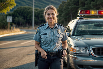 American policewoman in uniform in front of a police car. She is smiling and she is happy