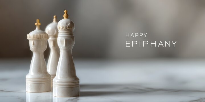 premium holiday card, premium glossy d postcard showcases polished three kings figurines, elegant sans-serif happy epiphany lettering, and modern visuals
