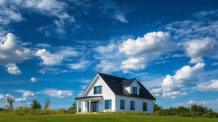A clean, white house with a bold black roof standing out vividly against a brilliant blue sky with scattered clouds, offering a timeless and polished look