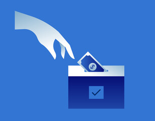 Political election illustration in modern flat gradient style. Human hand giving money to ballot box for politic campaign donation, financial bribery or voting fraud concept.