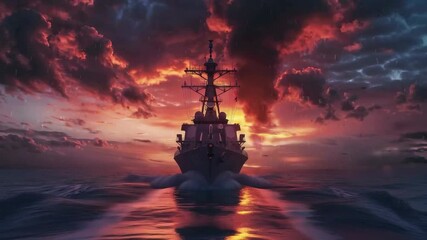 A warship against a backdrop of storm clouds and sunset symbolises tension — an excellent background for political news or military drama series.