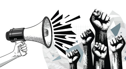 Illustration of a megaphone and raised fists symbolizing protest and activism.