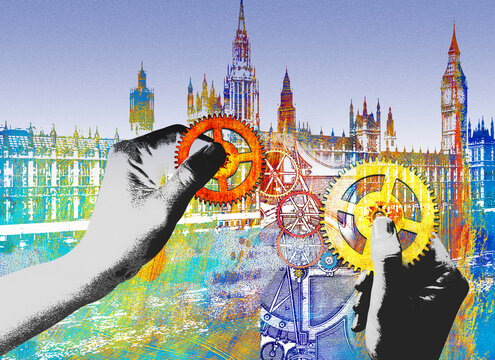 Close-up of politician signing important document on wooden desk, symbolizing political career and decision-making process with flag and city scape elements.