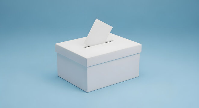Clean white ballot box with a vote card being cast, representing democratic election process