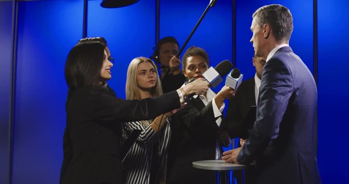 Middle-aged politician in suit talking to group of multiracial journalists having interview and suddenly leaving auditorium without any comment.