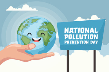 Cartoon background of the planet earth held by a hand with the text of the national pollution prevention day. Poster to raise awareness about caring for the environment