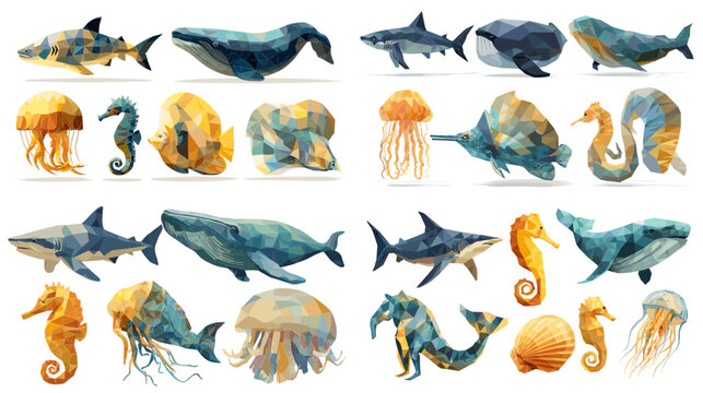 Geometric low poly illustration of whales, sharks, jellyfish, seahorses, and shells. Ideal for marine posters, educational materials, polygon vector art, and ocean conservation designs.