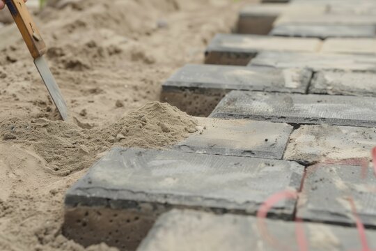 Landscaping worker contractor using plate compactor to apply polymeric joint sands on interlock pavers. Home garden and landscape renovation project background.