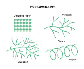 Vector illustration of polysaccharides examples. Starch, glycogen, and cellulose