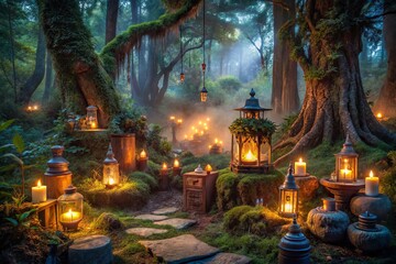 A mystical forest scene at twilight, lit by candles and lanterns, surrounded by ancient ritual artifacts, Nature's