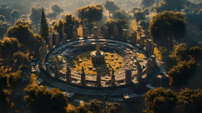 A circular temple dedicated to the Greek god Apollo, with statues lining the perimeter