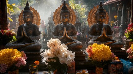 Polytheism represented in a grand temple courtyard adorned with intricate statues of deities and vibrant floral offerings