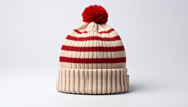 Warm Winter Knit Beanie Hat with Red Stripes and Pom Pom.