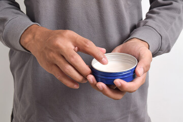 Man's hand holding pomade or waxe for hair styling isolated on white background