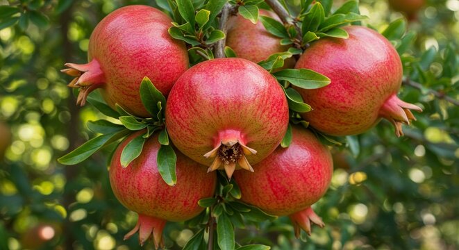 Lush pomegranate tree branch laden with ripe, vibrant red fruit against a blurred green foliage backdrop.