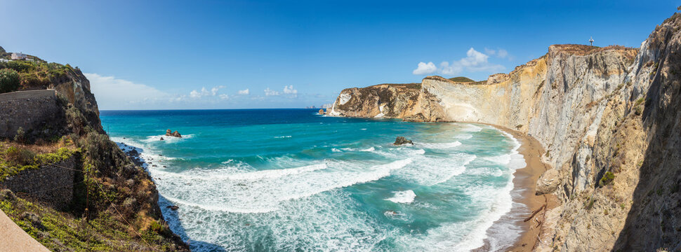 Panoramic view from the top of Chiaia di Luna beach in the Ponza island, Lazio, Italy. The beach is closed to tourists, due to falling rocks that killed several people. It can be admire from the sea