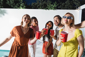 Interracial people with plastic cups looking at camera near swimming pool at night