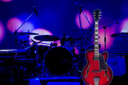 Rock music band, musicians playing on guitars, drum set and singer with microphone, soloist singing songs. Vector music players perform on electric string instruments, man sing in mic, jazz group