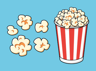 Six illustrations of popcorn in striped and solid containers, showing popping kernels