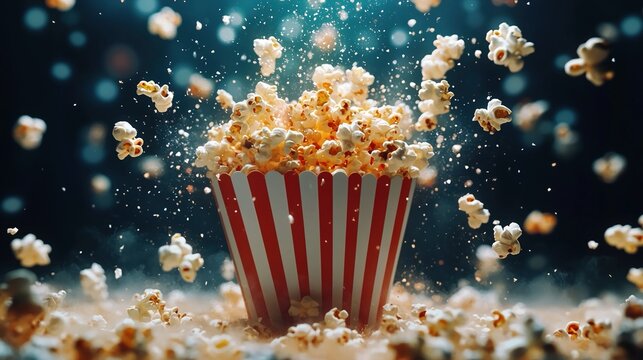 The delicious popcorn bursting from its striped container in cinematic ambiance.