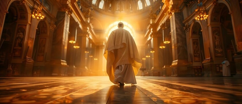 Pope walking gracefully through radiant cathedral hallways with blessing light shining behind. Concept Religious, Graceful, Cathedral, Light, Pope