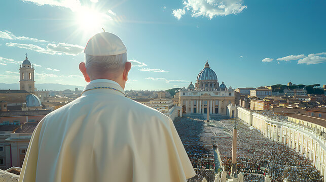 Photo of pope with his back turned to the camera greeting people Image ai generate
