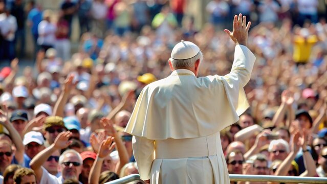 Pope standing back view with raised hand in front of crowd of greeting people