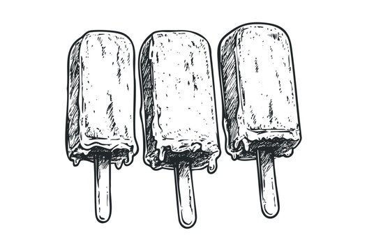 Detailed hand-drawn sketch of three ice pops on sticks in vintage style. Vector retro hand drawn illustration
