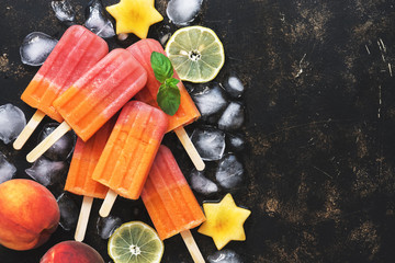 Peach popsicles with ice cubes on a rustic dark background. Top view, space for text.