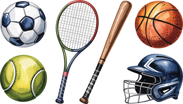 Watercolor illustration of various popular sports equipment with detailed rendering and vibrant colors