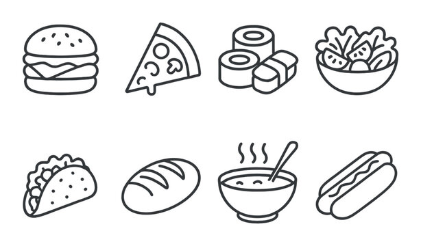 Monochrome icons of popular fast foods including burger, pizza, sushi, salad, and more