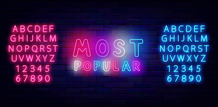 Most popular neon template. Shiny pink and blue alphabet. Colorful handwritten text. Vector stock illustration