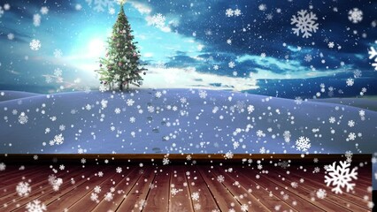 A digital animation of a snowfalling christmas tree in a snowy landscape